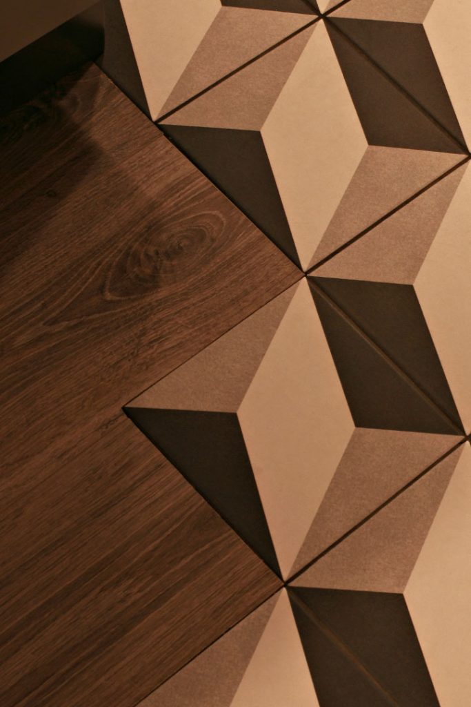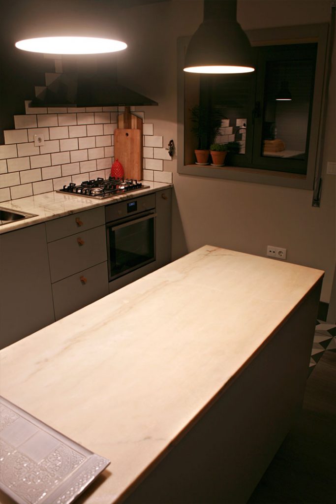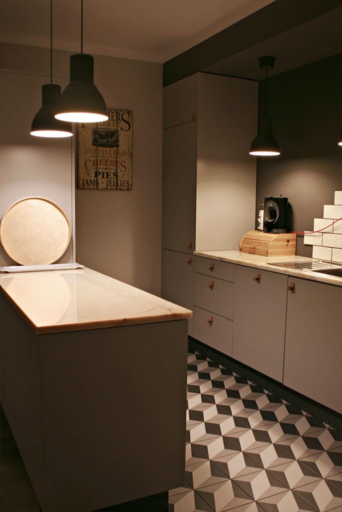 Os azulejos usam-se só onde são mesmo necessários, evitando salpicos de água e dos cozinhados. A pedra mármore da península conta as histórias da antiga cozinha, fizemos questão de a manter e adaptar as medidas dos móveis. O pavimento da cozinha funde-se de forma discreta com o restante da casa, como que de um convite se tratasse.