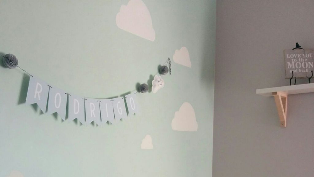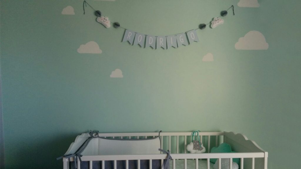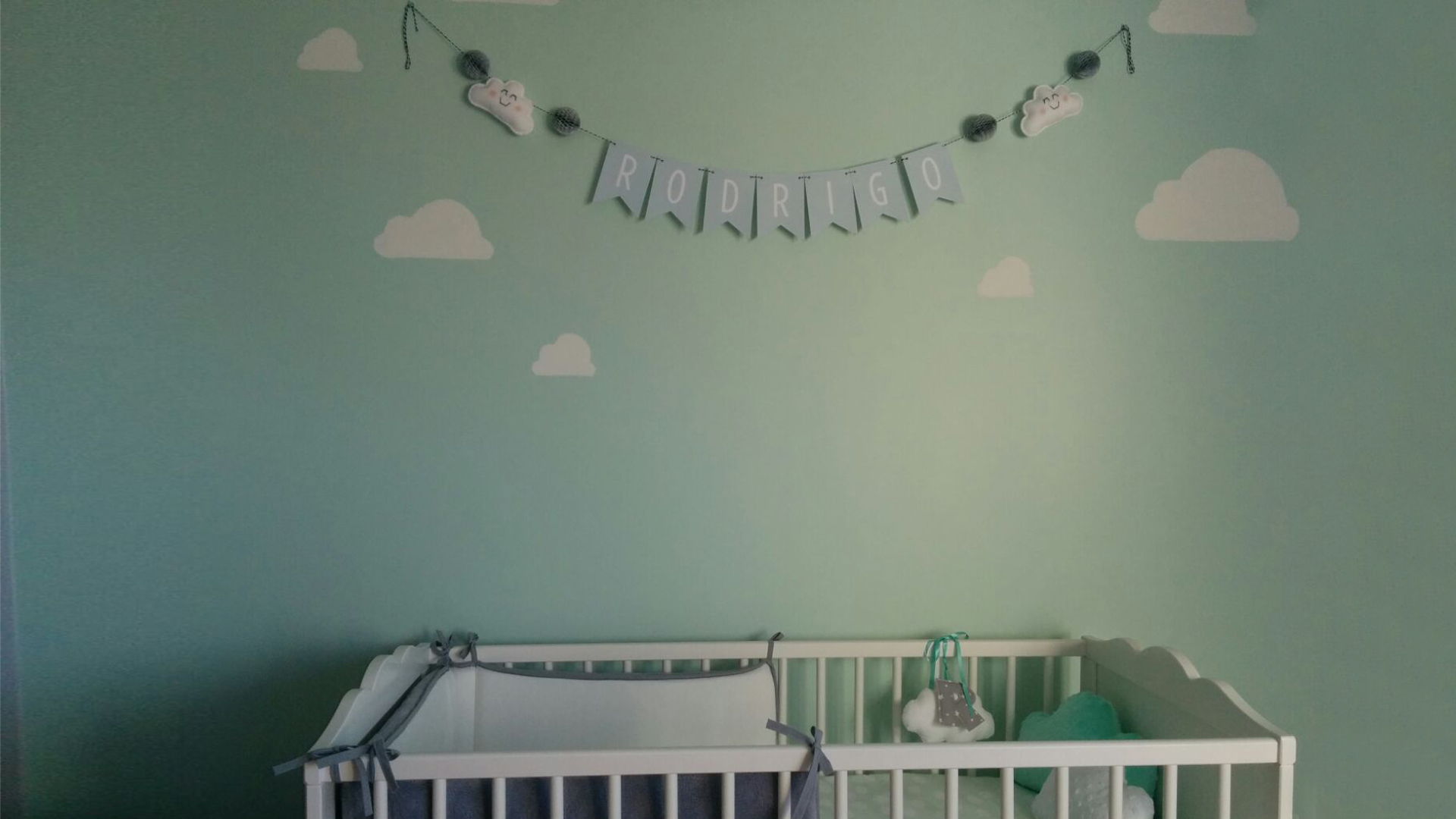Umas simples nuvens pintadas na parede juntamente com uma grinalda adquirida pelos pais, criou o ambiente tranquilo que se pretendia para receber um novo elemento nesta família.
