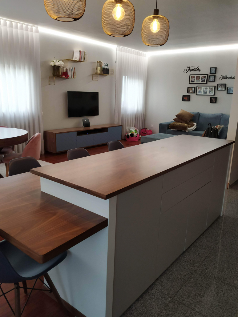 Tinham uma certeza, queriam tornar cozinha e sala num local só para que os momentos em família fossem mais efetivos em que o conforto e espaço para todos fosse o mote.