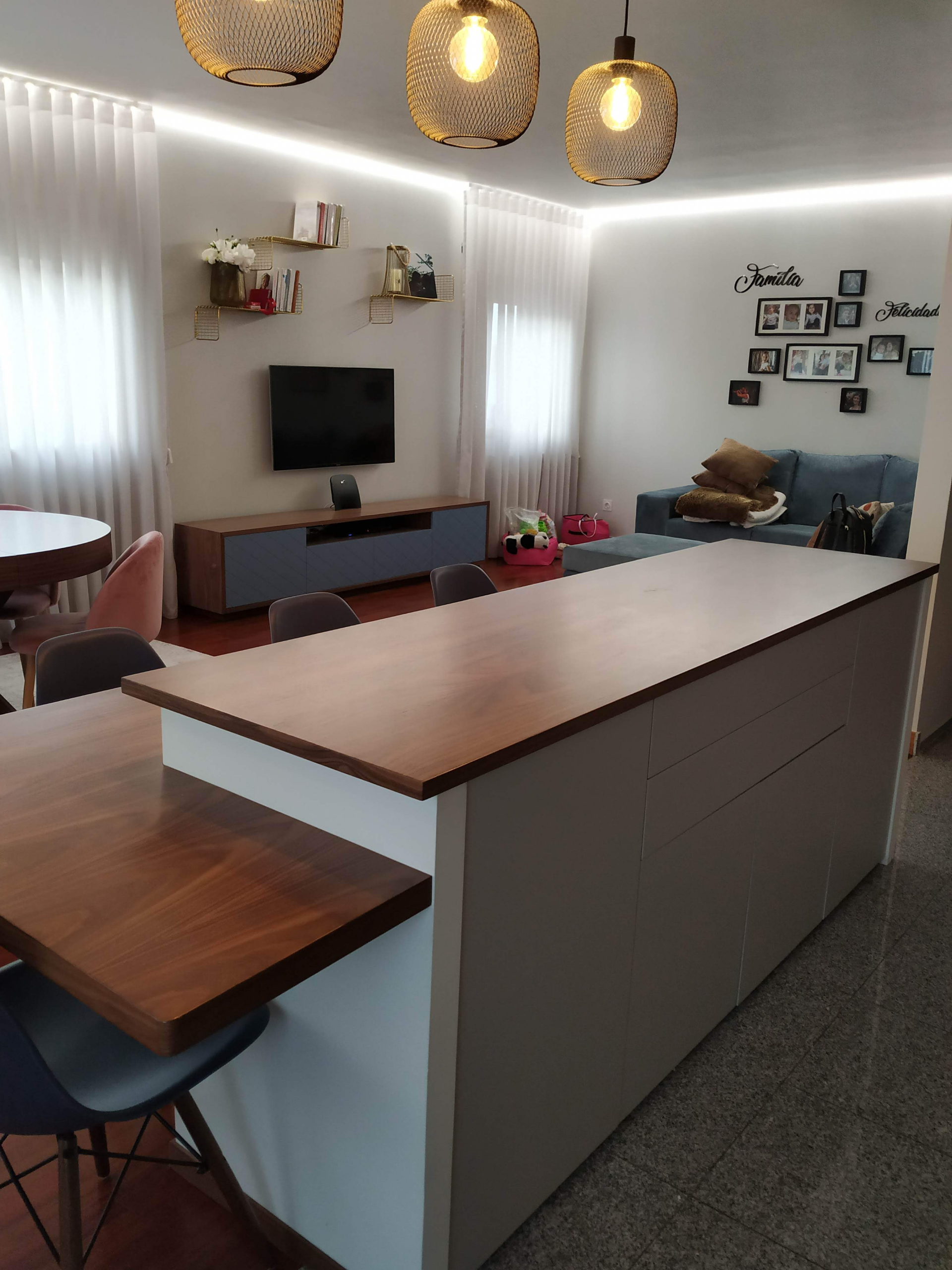 Arranjamos soluções interessantes, como o caso do aparador existente do qual não se queriam desfazer. Este foi transformado na ilha de cozinha, o local de refeições rápidas, dos trabalhos de casa e de reunião da família.