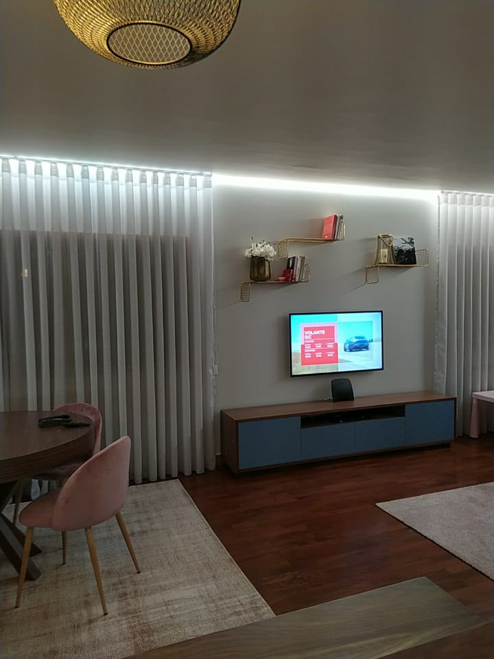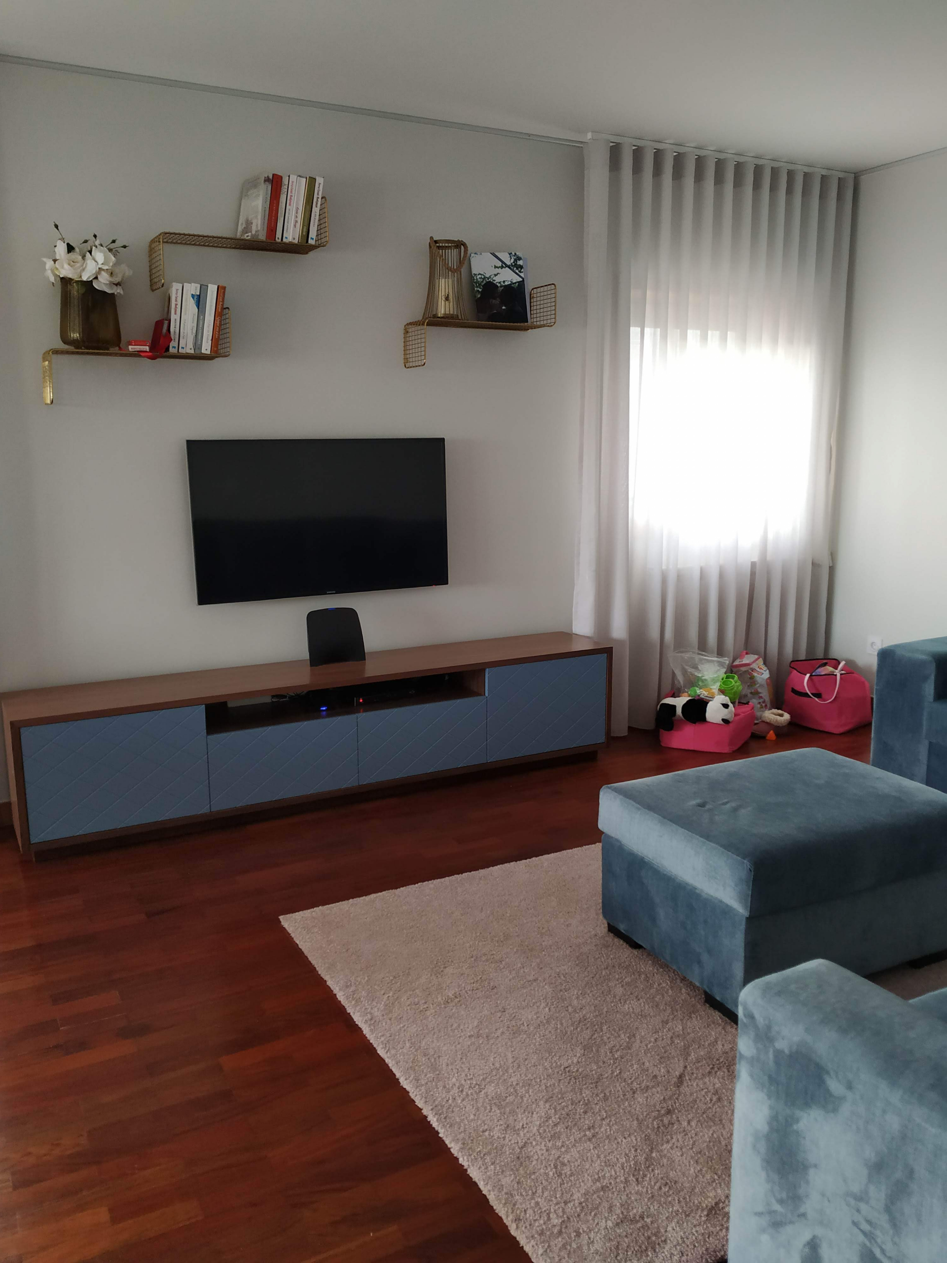 Depois de apresentadas algumas soluções para móvel de Tv, que nunca superavam as expectativas, desenhamos nós um móvel pelo qual os clientes se apaixonaram, uma peça única para esta sala.